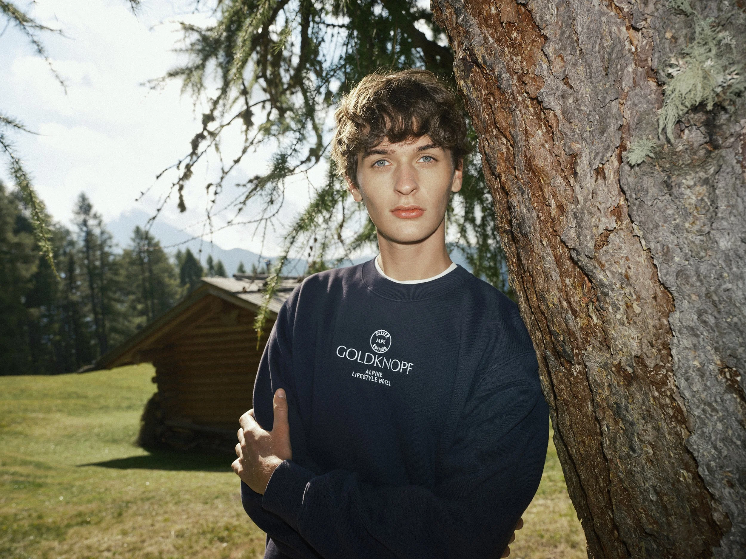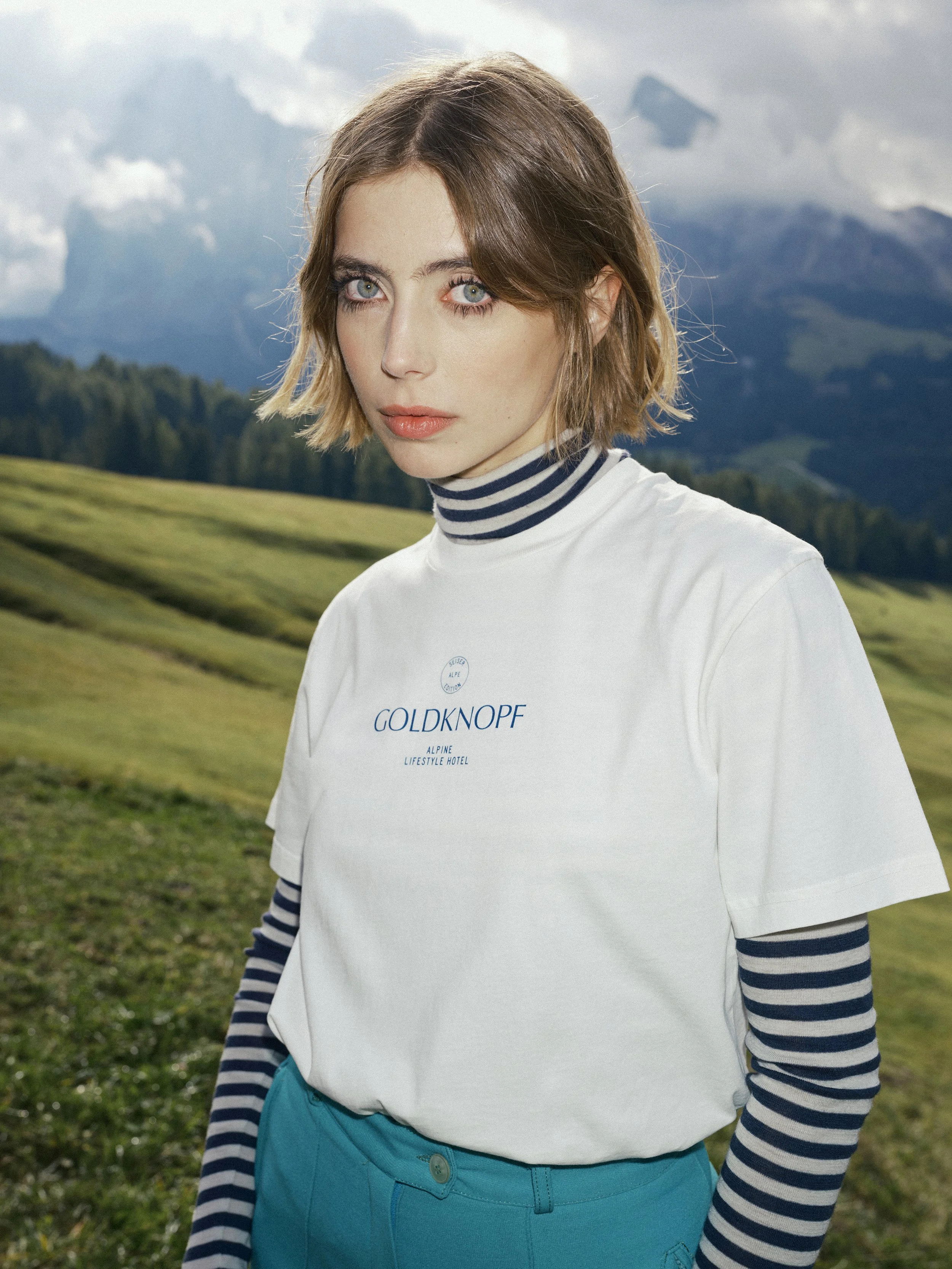 Für das höchstgelegene Hotel der Seiser Alm, das Golfknopf-Hotel, wurde ein schlichtes und harmonisches Design entwickelt. Der Pullover und das T-Shirt sind gestalterisch aufeinander abgestimmt und verkörpern den alpinen Charme, der das Hotel auszeichnet.